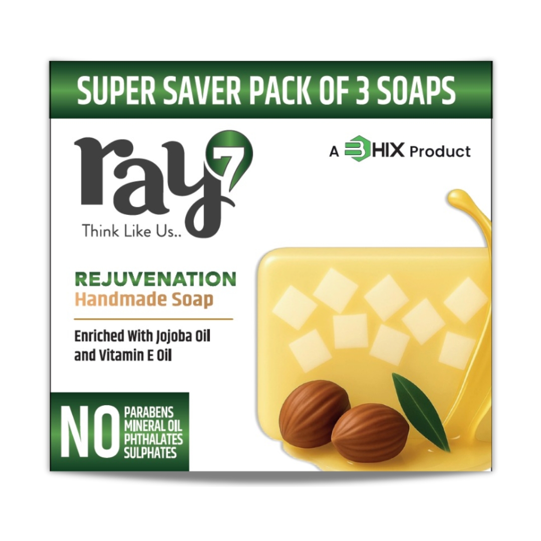 RAY7 Rejuvenation Handmade Soap, Glycerin Based with Jojoba Oil and Vitamin E Oil, Moisturising and Hydrating, for Glowing Soft Skin, Sulphate Free, Paraben Free, 100g, Pack of 3