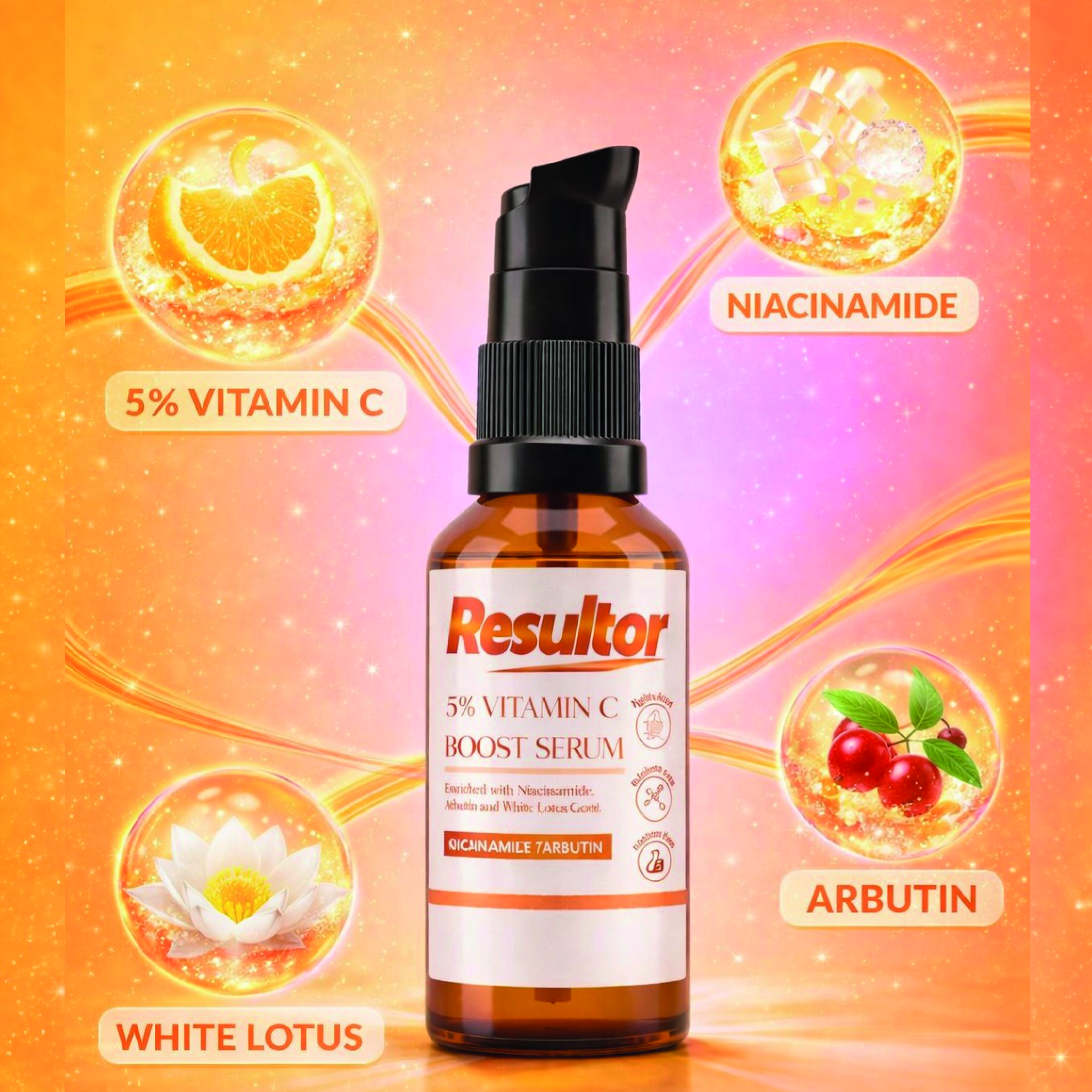 Resultor 5% Vitamin C Face Serum is a powerful daily glow solution designed to brighten skin, reduce pigmentation, and promote an even complexion. Infused with 5% stabilized Vitamin C, this lightweight serum helps fight dullness, dark spots, and early signs of aging while boosting your skin’s natural radiance.